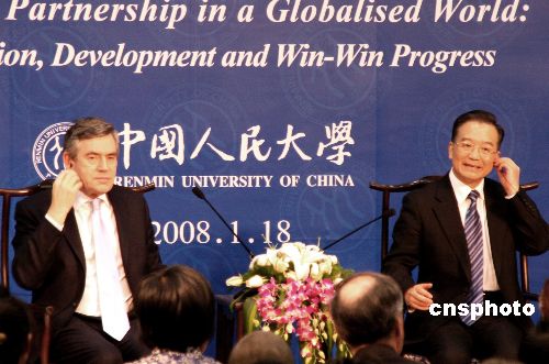 十八日下午,中國(guó)總理溫家寶與來華訪問的英國(guó)首相布朗一起來到中國(guó)人民大學(xué),與中英兩國(guó)的公眾代表進(jìn)行交流,共同回答兩國(guó)公眾關(guān)心的問題。中新社發(fā) 周兆軍 攝