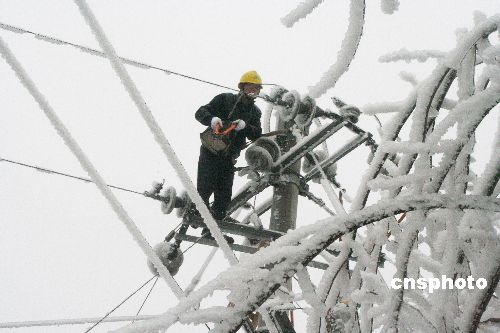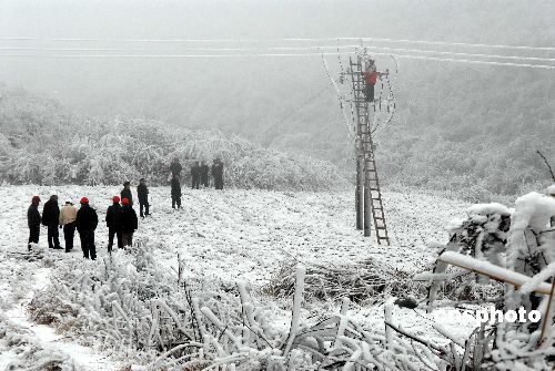 1月20至21日,黔東南州各縣電力職工在搶修受冰凍災(zāi)害的電力設(shè)施。連日來,由于持續(xù)出現(xiàn)大范圍雪凝天氣,貴州省黔東南州境內(nèi)的凱里電網(wǎng)(轄管黔東南州各縣市)遭遇自1984年以來最為嚴重的冰凍災(zāi)害,凱里電網(wǎng)部門及下屬的15家縣局已緊急采取措施,確保電網(wǎng)穩(wěn)定運行。1月14日以來,貴州黔東南地區(qū)溫度均在零下1攝氏度,是24年以來最為嚴重的一次,出現(xiàn)嚴重的覆冰。覆冰導(dǎo)致一些輸電設(shè)施桿塔和導(dǎo)地線不堪重負而倒塔斷線,電網(wǎng)設(shè)施受損嚴重。截止1月21日,凱里電網(wǎng)出現(xiàn)孤網(wǎng)運行,各縣農(nóng)網(wǎng)線路等輸配電線路都不同程度出現(xiàn)倒桿斷線的情況,造成黔東南州南部電網(wǎng)七個縣全部停電。冰災(zāi)發(fā)生后,凱里電網(wǎng)部門迅速啟動“抗冰保電”應(yīng)急預(yù)案,同時在當(dāng)?shù)孛襟w發(fā)布停電預(yù)警公告,并積極做好醫(yī)院、交通、通訊、礦山等重要客戶的安全用電工作。中新社發(fā) 吳如雄 攝