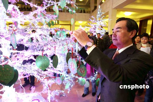一月二十四日,中國外交部等在北京人民大會堂舉辦慰問駐外外交人員暨親屬春節(jié)聯(lián)歡會,為他們帶去節(jié)日最真誠的祝福。圖為外交部副部長王毅將祝福卡懸掛在祝福樹上。中新社發(fā) 任海霞 攝
