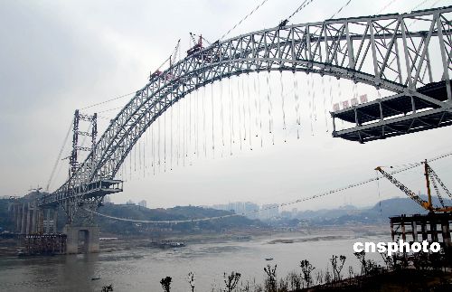 1月25日,“世界第一拱橋”的重慶朝天門長(zhǎng)江大橋主拱合龍。大橋主跨將在今年6月合龍,并于年底竣工通車。重慶朝天門長(zhǎng)江大橋2004年底動(dòng)工,由主橋和東西引橋三部分組成,為中承式鋼桁系桿拱橋,雙層設(shè)計(jì),上層為雙向6車道,下層為雙向輕軌和雙向4條預(yù)留車道。大橋兩座主墩主跨長(zhǎng)達(dá)552米,比世界著名拱橋澳大利亞悉尼大橋的主跨還要長(zhǎng),成為“世界第一拱橋”。中新社發(fā) 郭晉嘉 攝
