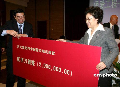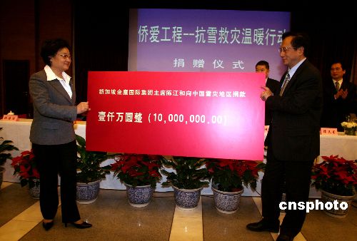 1月31日,新成立的中國僑商投資企業(yè)協(xié)會(huì)在北京發(fā)出倡議,希望廣大僑商積極行動(dòng)起來,為抗雪救災(zāi)伸出援助之手,得到了來自泰國、新加坡、香港、澳門等十多家僑商投資企業(yè)的積極響應(yīng)。 中國僑商投資企業(yè)協(xié)會(huì)常務(wù)副會(huì)長、新加坡金鷹國際集團(tuán)主席陳江和先生第一個(gè)對(duì)倡議作出響應(yīng)。在國務(wù)院僑辦舉行的“僑愛工程——抗雪救災(zāi)溫暖行動(dòng)”捐贈(zèng)儀式上,陳江和先生慷慨捐贈(zèng)了1000萬元,中國僑商投資企業(yè)協(xié)會(huì)會(huì)長、泰國正大集團(tuán)董事長謝國民先生和中國僑商投資企業(yè)協(xié)會(huì)副會(huì)長、福耀玻璃工業(yè)集團(tuán)董事局主席曹德旺先生分別捐贈(zèng)了200萬元。目前更多善款還在匯集中。這些款項(xiàng)將通過國務(wù)院僑辦轉(zhuǎn)送受災(zāi)地區(qū)人民政府。國務(wù)院僑辦主任李海峰等出席捐贈(zèng)儀式。中新社發(fā) 張勤 攝