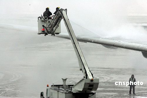 2月2日上午,2008年兩岸春節(jié)包機上海航點首個航班——東航MU五00七次航班,冒著數(shù)十年未遇的罕見風雪在上海浦東機場起飛。圖為浦東機場為春節(jié)包機優(yōu)先提供特別的除冰服務(wù)。中新社發(fā) 潘索菲 攝