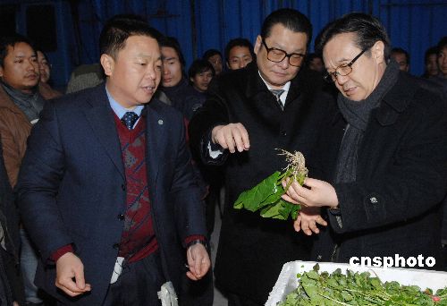 二月二日下午,中國(guó)商務(wù)部副部長(zhǎng)高虎城(右一)一行冒雨抵達(dá)深圳,考察深圳南山農(nóng)產(chǎn)品批發(fā)市場(chǎng)供港果菜基地,要求深圳政府及供應(yīng)商克服困難、保障香港市場(chǎng)的需求。深圳市政府副市長(zhǎng)陳應(yīng)春表示,深圳人寧愿少吃,也要保障香港同胞不斷檔。中新社發(fā) 陳文 攝
