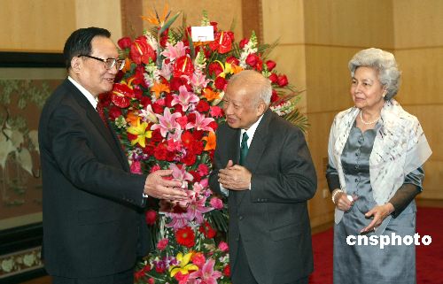 2月4日,受中國(guó)國(guó)家主席胡錦濤和國(guó)務(wù)院總理溫家寶的委托,國(guó)務(wù)委員唐家璇專程看望在北京的柬埔寨太皇諾羅敦·西哈努克和太后諾羅敦·莫尼列·西哈努克。中新社發(fā) 盛佳鵬 攝