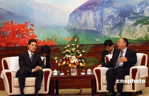 2月26日,英國外交大臣戴維·米利班德一行抵渝進行訪問。據(jù)稱,此次訪問重點是了解重慶市政府在縮小城鄉(xiāng)差距領(lǐng)域所作出的努力,戴維·米利班德一行將實地走訪重慶建筑工地和農(nóng)村,了解當?shù)剞r(nóng)民、農(nóng)民工及其子女的生活教育狀況。圖為重慶市常務(wù)副市長黃奇帆(右一)會見戴維·米利班德(左一)。中新社發(fā) 郭晉嘉 攝
