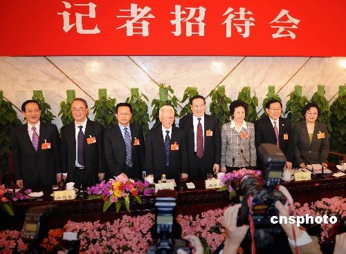 三月六日下午,全國(guó)政協(xié)十一屆一次會(huì)議記者招待會(huì)在北京人民大會(huì)堂新聞發(fā)布廳舉行,主題是“民主黨派中央主席談多黨合作”。九三學(xué)社中央主席韓啟德、農(nóng)工黨中央主席桑國(guó)衛(wèi)、民建中央主席陳昌智、民革中央主席周鐵農(nóng)、民盟中央主席蔣樹(shù)聲、民進(jìn)中央主席嚴(yán)雋琪、致公黨中央主席萬(wàn)鋼、臺(tái)盟中央主席林文漪(從左至右)共同亮相,受到中外媒體的熱烈關(guān)注。中新社發(fā) 廖攀 攝