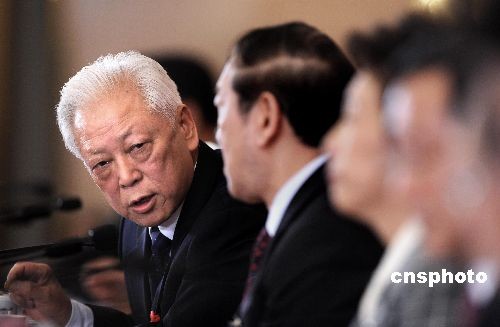 三月六日下午,全國(guó)政協(xié)十一屆一次會(huì)議記者招待會(huì)在北京人民大會(huì)堂新聞發(fā)布廳舉行,主題為“民主黨派中央主席談多黨合作”,中國(guó)八個(gè)民主黨派中央主席共同出席。圖為民革中央主席周鐵農(nóng)。中新社發(fā) 廖攀 攝