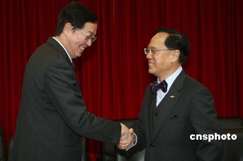 3月18日,香港特別行政區(qū)行政長(zhǎng)官曾蔭權(quán)在北京先后拜訪了中國(guó)人民銀行和中國(guó)證券監(jiān)督管理委員會(huì)。圖為曾蔭權(quán)與中國(guó)人民銀行行長(zhǎng)周小川握手。中新社發(fā) 盛佳鵬 攝