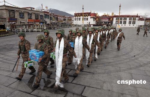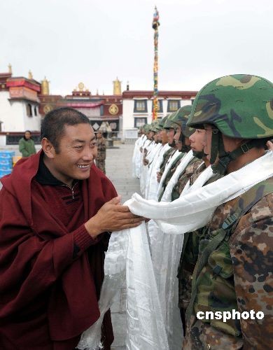 拉薩大昭寺的僧人向在大昭寺廣場上執(zhí)勤的武警官兵敬獻(xiàn)哈達(dá)
