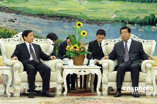 4月23日,中國(guó)全國(guó)政協(xié)主席賈慶林在北京人民大會(huì)堂會(huì)見(jiàn)來(lái)訪的越共中央對(duì)外部部長(zhǎng)陳文恒。中新社發(fā) 盛佳鵬 攝
