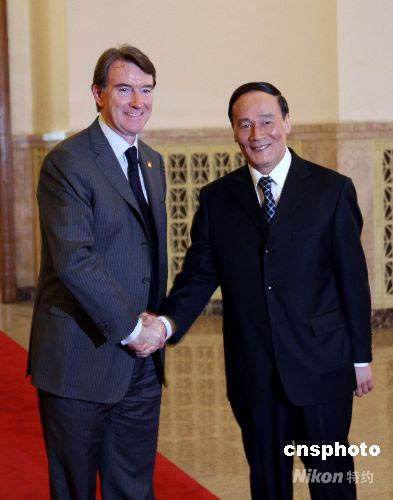 四月二十五日,首次中歐經(jīng)貿(mào)高層對話在北京人民大會堂舉行。中國國務院副總理王岐山和歐盟貿(mào)易委員曼德爾森共同主持對話。這將成為中歐間最高級別的對話平臺。 中新社發(fā) 任海霞 攝