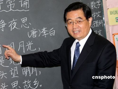 胡錦濤給日本中華學(xué)校小學(xué)生講解唐詩《靜夜思》