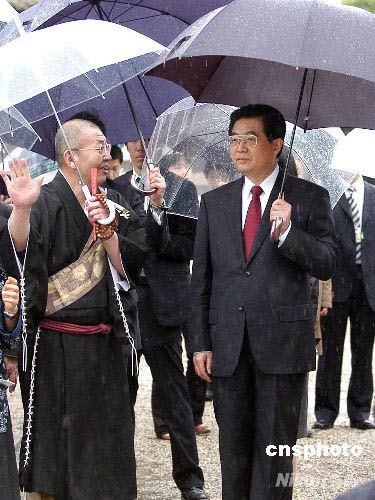 正在日本進行國事訪問的中國國家主席胡錦濤,十日冒雨參觀位于奈良的法隆寺。法隆寺是日本佛教圣德宗的總寺廟,寺內(nèi)供奉有百濟觀音等大量國寶級文物,是日本佛教文化寶庫。中新社發(fā) 齊彬 攝