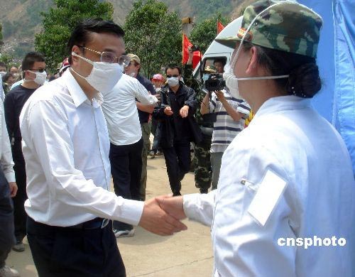 5月19日下午,中共中央政治局常委、國務院副總理李克強來到北川縣城救災現(xiàn)場,視察指導現(xiàn)場救援工作,李克強在察看了北川縣受災全貌后,慰問了在重慶消防總隊醫(yī)院在北川縣城救援點設(shè)置的急救帳篷里工作的官兵。中新社發(fā) 陳誠 攝