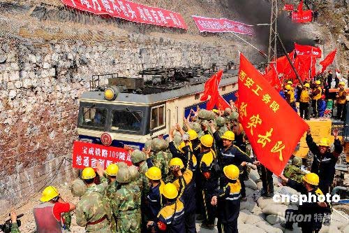 5月24日上午,首列滿載運(yùn)往四川災(zāi)區(qū)救災(zāi)物資的搶977次列車,從寶成線徽縣至虞關(guān)站間109號隧道安全通過,這標(biāo)志著因地震塌方在隧道內(nèi)脫線起火、中斷行車283小時的寶成鐵路全線,比預(yù)計(jì)時間提前7天恢復(fù)通車。 寶成鐵路是通往西南的鐵路大動脈,是四川抗震救災(zāi)的生命線。5月12日14時28分,因四川汶川發(fā)生8級強(qiáng)烈地震引發(fā)山體崩塌,致使運(yùn)行中的一列貨物列車在西安鐵路局管內(nèi)寶成線徽縣至虞關(guān)站間撞巨石脫線,12節(jié)裝有汽油的罐車被埋在109號隧道中起火燃燒,造成通往四川地震災(zāi)區(qū)的大動脈寶成鐵路中斷行車。險(xiǎn)情發(fā)生后,經(jīng)過鐵路職工、解放軍指戰(zhàn)員、武警官兵等2200多名搶險(xiǎn)人員連續(xù)12個晝夜奮力搶修,終于將寶成鐵路109號隧道順利搶通。