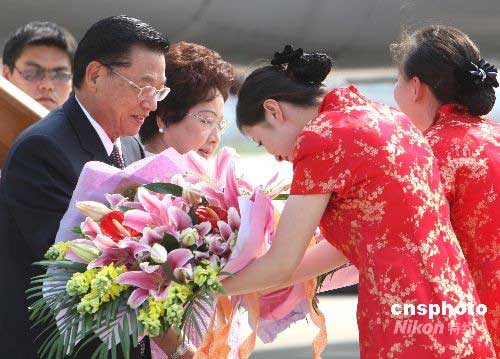 十一日下午三時(shí)十五分許,臺灣海峽交流基金會董事長江丙坤率;鶗韴F(tuán)抵達(dá)北京首都機(jī)場,禮儀小姐敬獻(xiàn)鮮花。中新社發(fā) 趙振清 攝