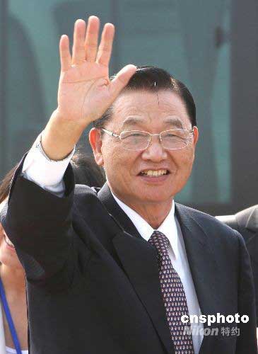 十一日下午三時十五分許,臺灣海峽交流基金會董事長江丙坤率;鶗韴F抵達北京首都機場,向在場的中外媒體揮手致意。中新社發(fā) 趙振清 攝