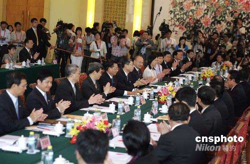 6月12日上午,海峽兩岸關(guān)系協(xié)會新任會長陳云林與臺灣海峽交流基金會董事長江丙坤在北京釣魚臺五號樓舉行會談。陳云林致詞后,與會雙方報以熱烈掌聲。中新社發(fā) 任晨鳴 攝
