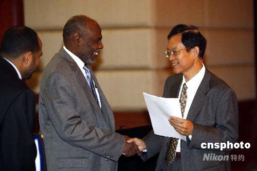 6月26日,以“和平、發(fā)展”為主題的蘇丹達爾富爾問題國際研討會在北京舉行,中國政府達爾富爾問題特別代表劉貴今(右)和參會代表在會前交談。中新社發(fā) 杜洋 攝