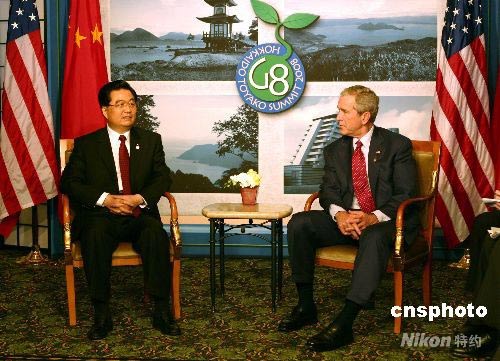 正在日本北海道出席八國集團(tuán)同發(fā)展中國家領(lǐng)導(dǎo)人對話會的中國國家主席胡錦濤,當(dāng)?shù)貢r間7月9日下午會見美國總統(tǒng)布什,雙方就中美關(guān)系和其他共同關(guān)心的問題深入交換了意見。布什還表示,希望得到美國和中國的奧運(yùn)會籃球比賽的門票。他笑著對胡錦濤說:“如果您能幫我搞到票的話,我將非常感激。” 中新社發(fā) 張朔 攝
