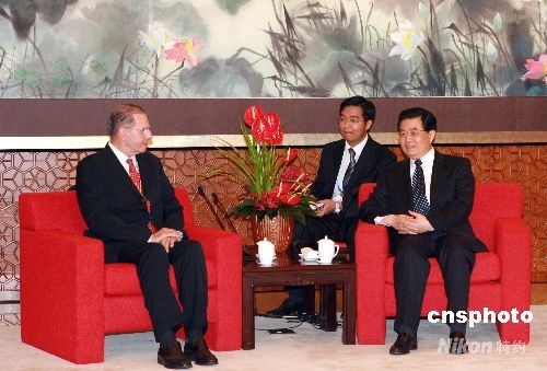 8月4日晚,中國(guó)國(guó)家主席胡錦濤在北京會(huì)見(jiàn)國(guó)際奧委會(huì)主席羅格等國(guó)際奧委會(huì)貴賓。中新社發(fā) 廖文靜 攝
