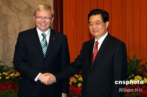 八月九日,中國國家主席胡錦濤在北京人民大會堂會見澳大利亞總理陸克文。中新社發(fā) 任海霞 攝