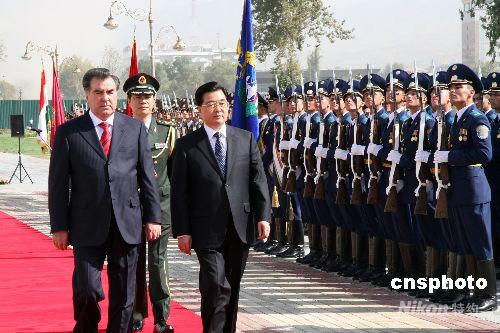 八月二十七日,塔吉克斯坦總統(tǒng)拉赫蒙在新落成的民族宮前廣場舉行盛大儀式,歡迎中國國家主席胡錦濤對塔吉克斯坦進行首次國事訪問。中新社發(fā) 齊彬 攝