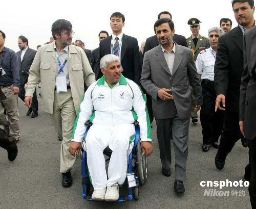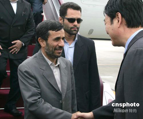 9月6日,伊朗總統(tǒng)艾哈邁迪-內(nèi)賈德飛抵首都國際機場,前來出席北京殘奧會開幕式及相關活動。中新社發(fā) 富田 攝