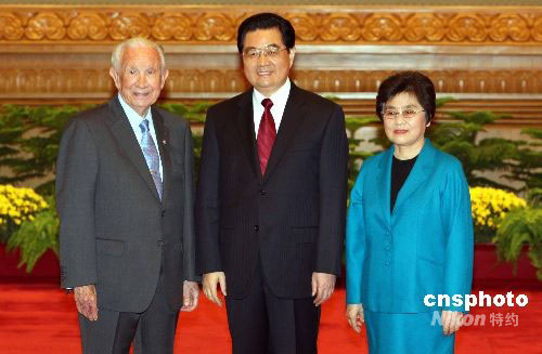 九月六日,中國國家主席胡錦濤和夫人劉永清在北京人民大會堂歡迎出席2008年殘奧會的各國貴賓。圖為胡錦濤夫婦與國際奧委會名譽(yù)主席薩馬蘭奇先生合影。中新社發(fā) 任海霞 攝