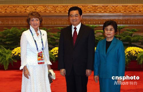 9月6日,中國國家主席胡錦濤夫婦在北京人民大會堂歡迎出席2008年殘奧會的各國貴賓。圖為胡錦濤夫婦歡迎殘奧委會榮譽(yù)委員荷蘭公主瑪格麗特。中新社發(fā) 任海霞 攝