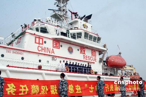9月21日下午,中國裝備最先進、救助功能最全的大馬力遠洋專用救助船“南海救一一二”輪一切準備就緒,從上海外高橋碼頭出征西太平洋海域,待命深海執(zhí)行神舟七號載人航天飛行任務海上應急救援任務。中新社發(fā) 陸從兵 攝