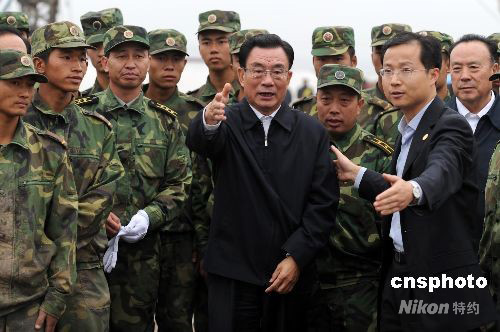 9月24日,出席寧夏回族自治區(qū)成立50周年慶;顒(dòng)的中央代表團(tuán)團(tuán)長賀國強(qiáng)來到固原市,向正在為當(dāng)?shù)孛癖姶蚓膶幭能妳^(qū)官兵們表示慰問。寧夏軍區(qū)一個(gè)給水團(tuán)正實(shí)施新一輪“百井支農(nóng)富民”工程,初步解決近5萬人用水問題。中新社發(fā) 廖攀 攝