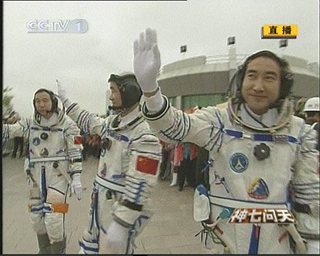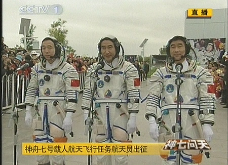 北京時間二十五日下午五時三十五分許,“神七”航天員乘組在中國酒泉衛(wèi)星發(fā)射中心航天公寓“問天閣”廣場舉行出征儀式,身穿乳白色艙內(nèi)航天服的“神七”三名航天員翟志剛、劉伯明、景海鵬受命出征太空。