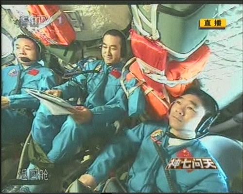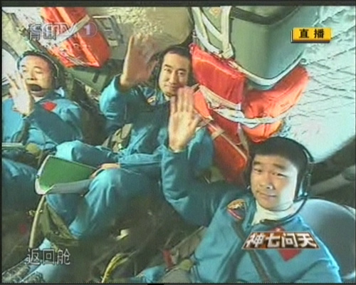 北京時(shí)間9月27日傍晚,在成功實(shí)施出艙活動(dòng)后,航天員回到返回艙,與在北京航天飛行控制中心的中共中央總書記、國家主席、中央軍委主席胡錦濤進(jìn)行天地通話。