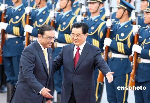 10月15日下午,中國國家主席胡錦濤在北京人民大會堂東門外廣場舉行儀式,歡迎巴基斯坦總統(tǒng)扎爾達(dá)里訪華。扎爾達(dá)里總統(tǒng)是應(yīng)胡錦濤的邀請從10月14日至17日對中國進(jìn)行國事訪問,這是扎爾達(dá)里就任總統(tǒng)后的首次正式出訪。中新社發(fā) 任晨鳴 攝
