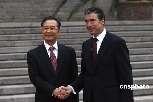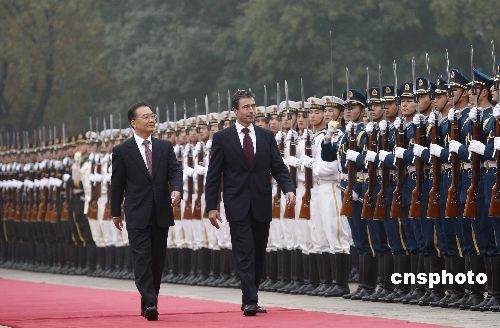 10月22日,中國國務(wù)院總理溫家寶在北京人民大會(huì)堂東門外廣場舉行儀式,歡迎丹麥?zhǔn)紫嗬鼓律。中新社發(fā) 盛佳鵬 攝