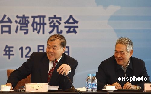 12月2日,2008年臺灣政局暨兩岸關系回顧與展望研討會在北京舉行,全國臺灣研究會執(zhí)行副會長兼秘書長周志懷(左),全國臺灣研究會副會長許世銓參加研討會。中新社發(fā) 盛佳鵬 攝