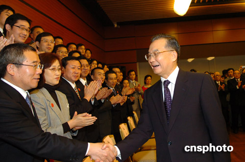 12月13日晚,正在日本福岡出席中日韓三國領(lǐng)導(dǎo)人會議的中國總理溫家寶親切接見了當(dāng)?shù)厝A人華僑及中國駐日使館和駐福岡總領(lǐng)館人員,鼓勵大家面對世界性的金融和經(jīng)濟(jì)危機(jī),要有戰(zhàn)勝困難的決心。 中新社發(fā) 朱沿華 攝