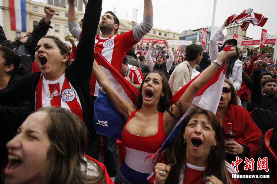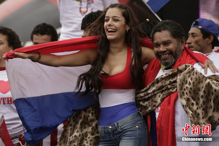 6月29日,巴拉圭點(diǎn)球大戰(zhàn)5-3擊敗日本。著名乳神女球迷拉里薩再度胸夾手機(jī)亮相,并與日本球迷同樂(lè),瘋狂慶祝盡顯激情狂野。