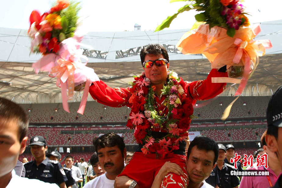 7月2日,在鳥巢上空艱難生活60天之后,高空王子阿迪力告別鳥巢回到地面,同時創(chuàng)造了60天累計連續(xù)走綱絲時間最長吉尼斯世界紀錄。圖為阿迪力用吊威亞的方式回到地面。中新社發(fā) 富田 攝
