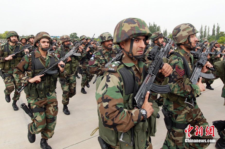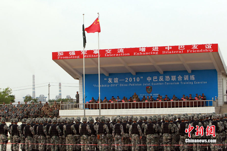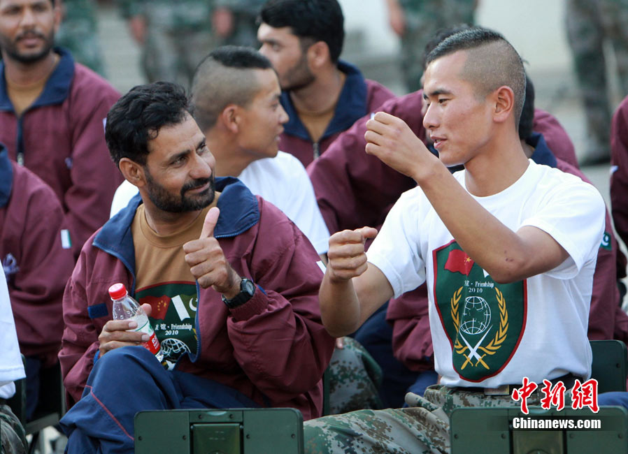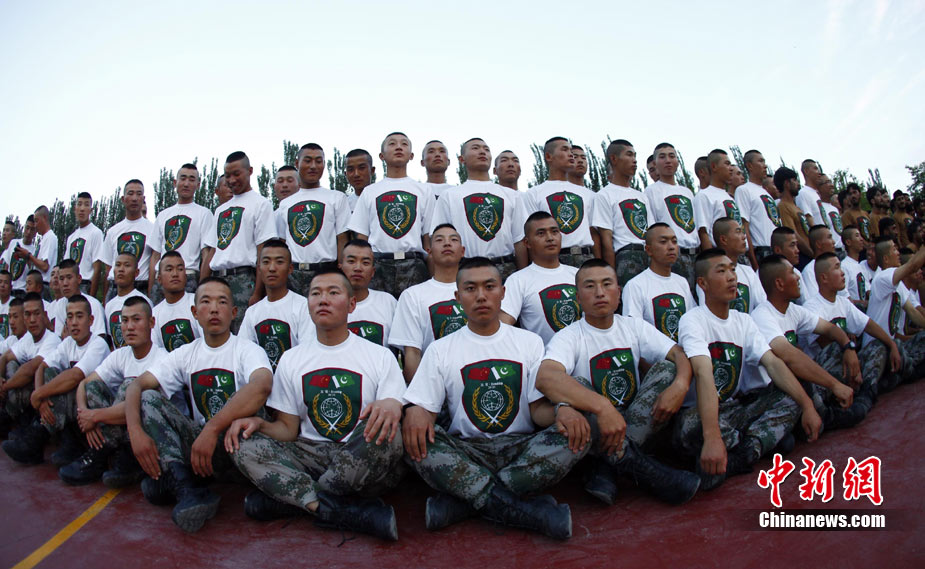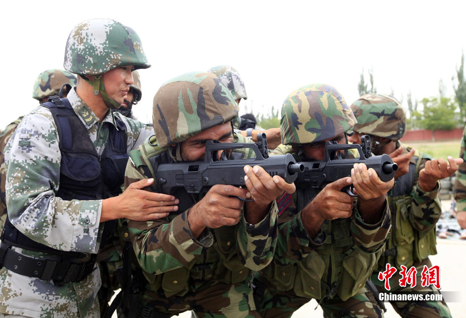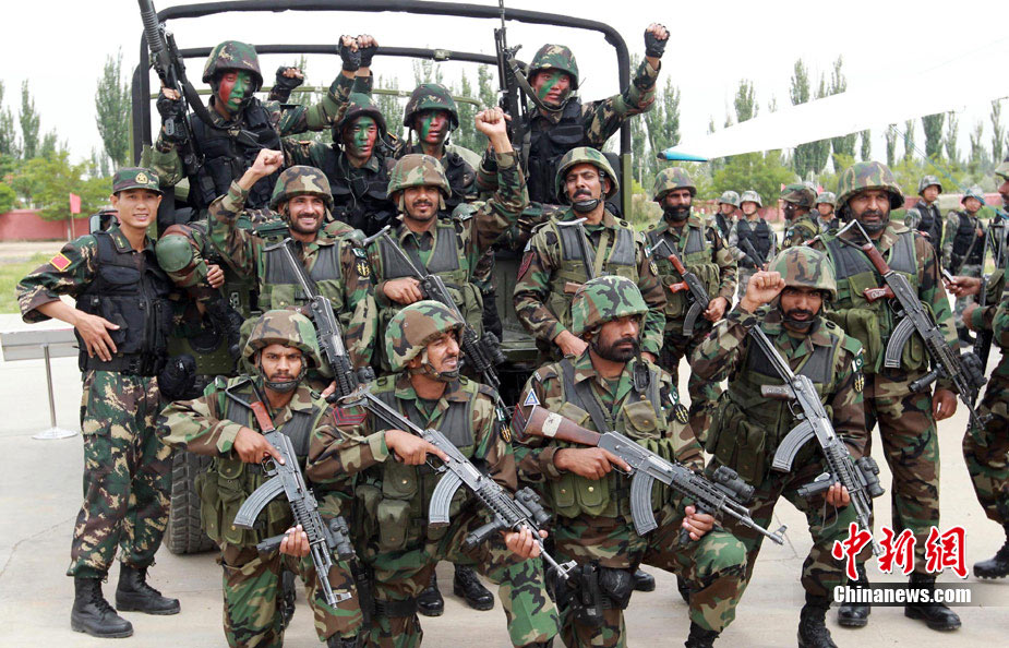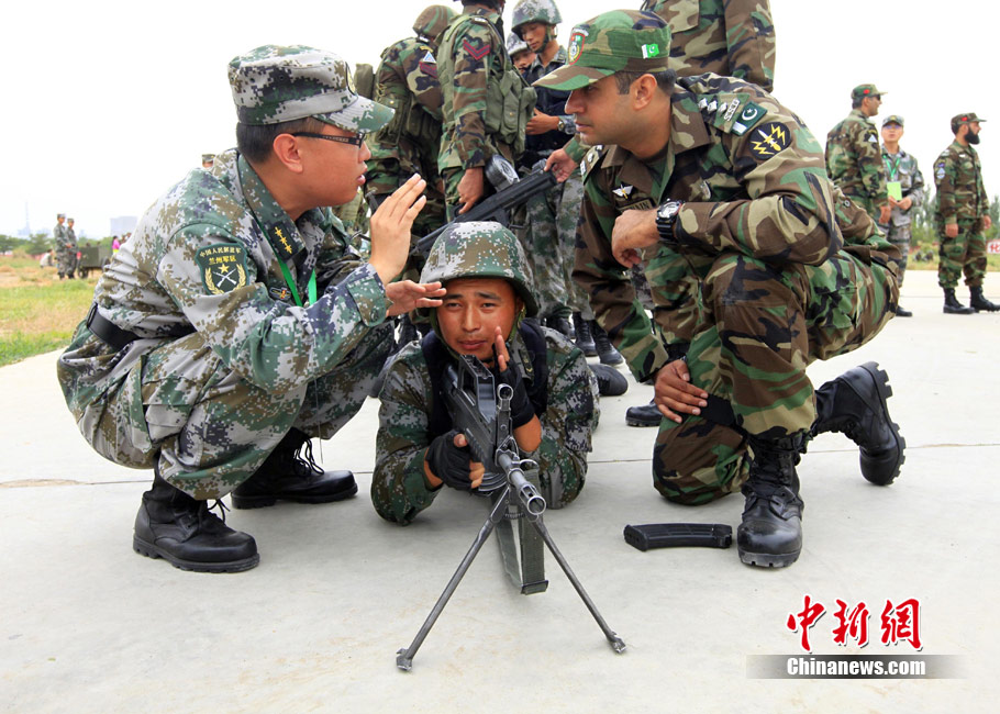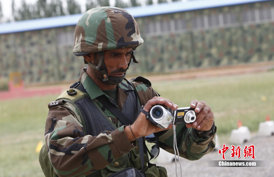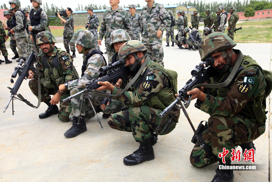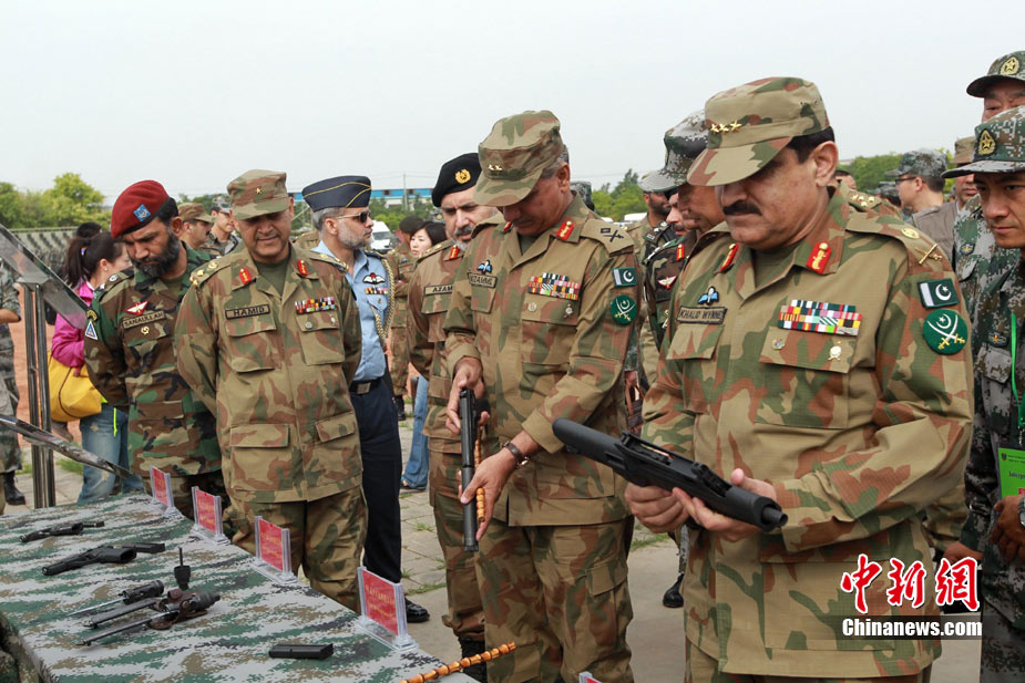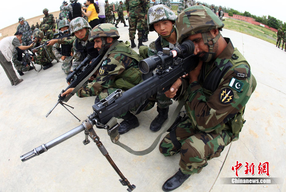 7月3日,代號(hào)“友誼—2010”的中國(guó)巴基斯坦反恐聯(lián)合訓(xùn)練在中國(guó)寧夏青銅峽地區(qū)展開(kāi),此次訓(xùn)練主要以邊境地區(qū)山地聯(lián)合反恐作戰(zhàn)為課題,分為展示交流、混編同訓(xùn)、綜合演練三個(gè)階段。圖為中國(guó)巴基斯坦兩軍特戰(zhàn)部隊(duì)交流展示反恐裝備。中新社發(fā) 杜洋 攝