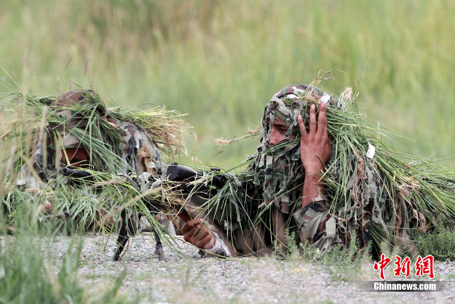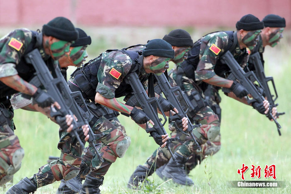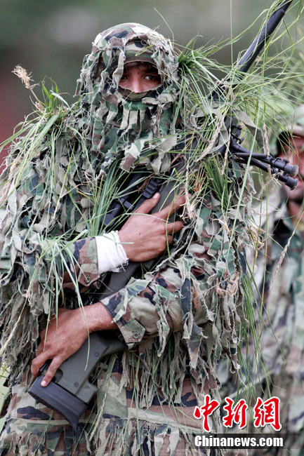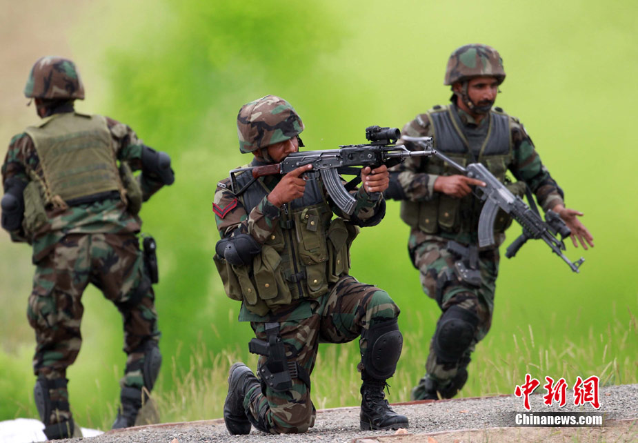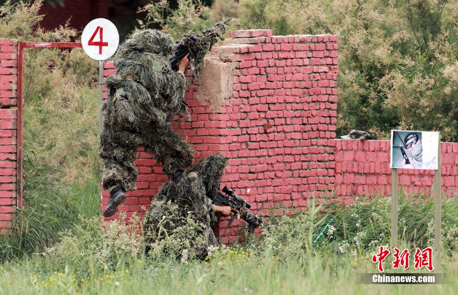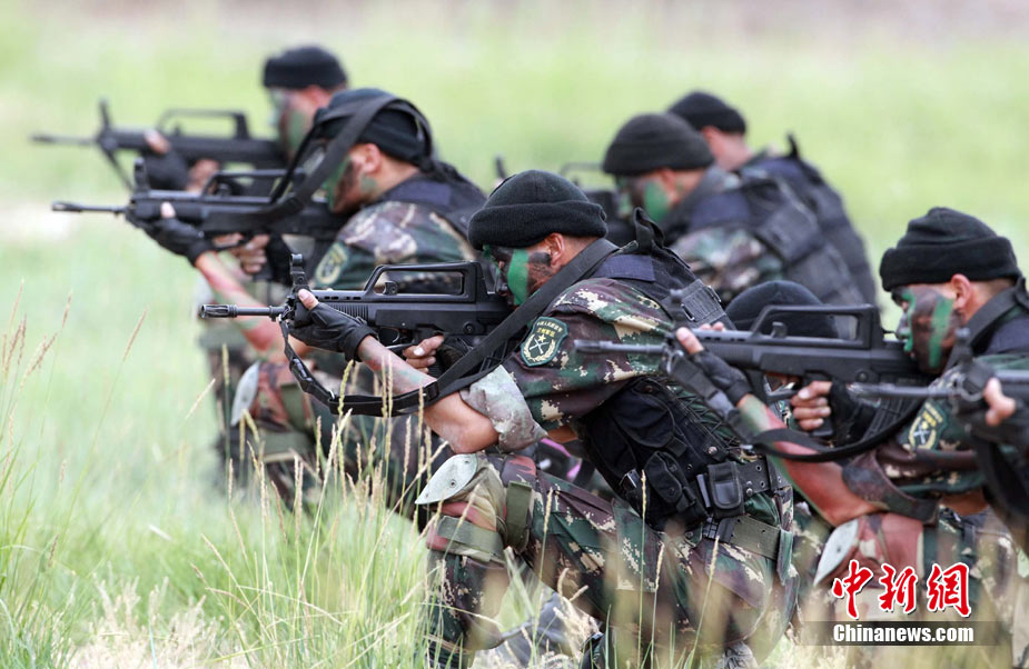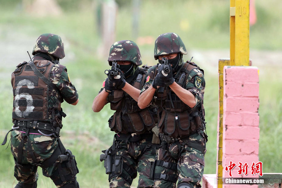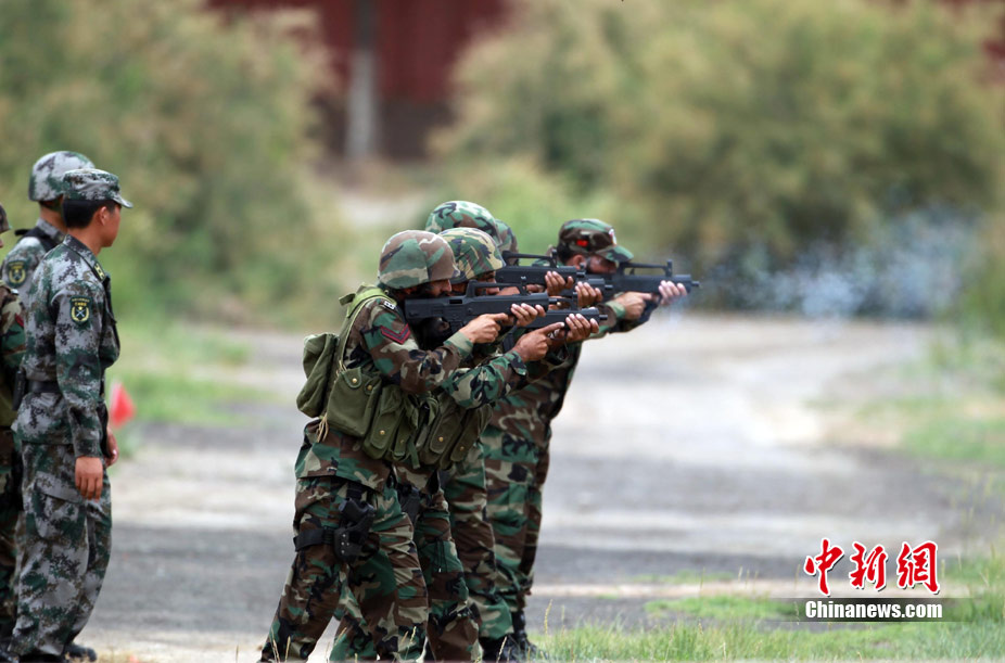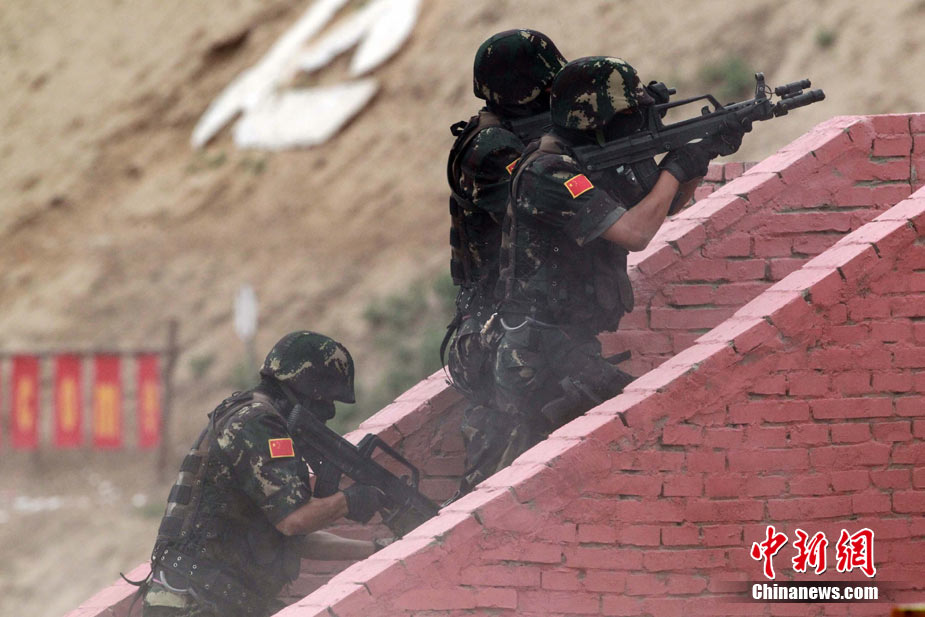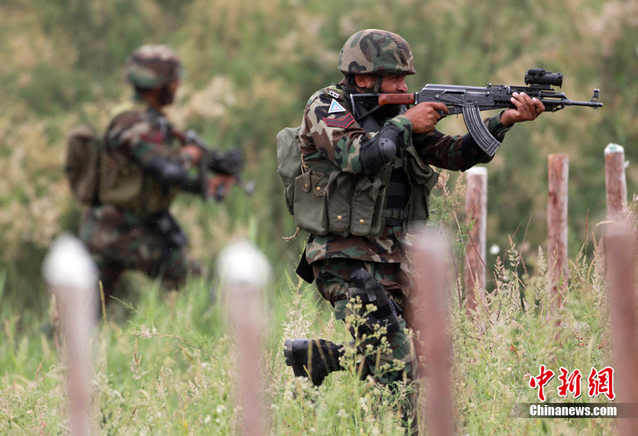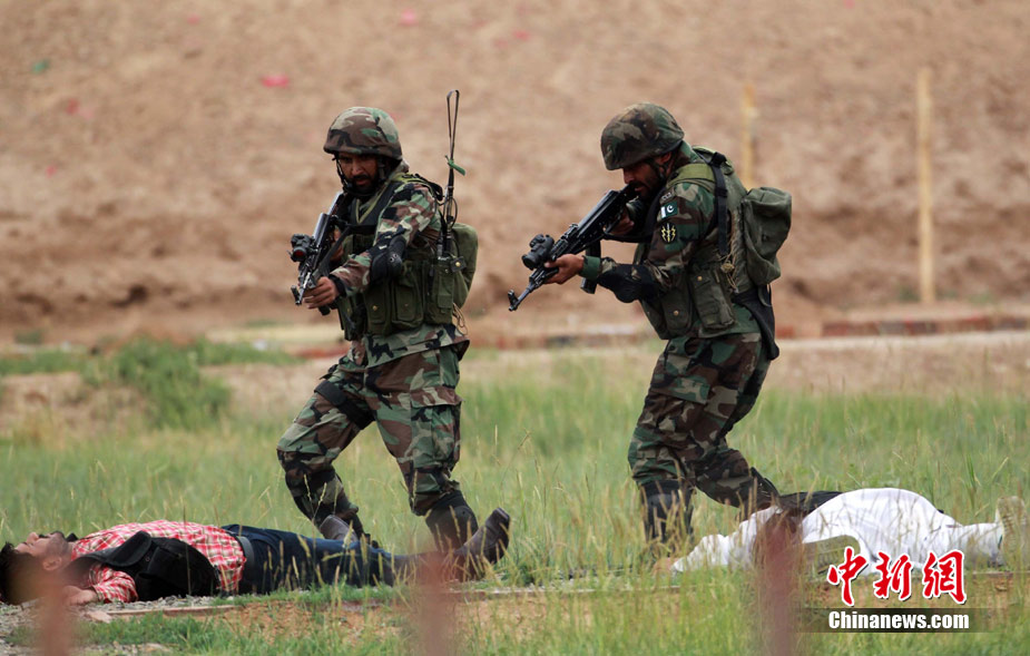 7月3日,代號(hào)“友誼—2010”的中國(guó)巴基斯坦反恐聯(lián)合訓(xùn)練在中國(guó)寧夏青銅峽地區(qū)展開(kāi),此次訓(xùn)練主要以邊境地區(qū)山地聯(lián)合反恐作戰(zhàn)為課題,分為展示交流、混編同訓(xùn)、綜合演練三個(gè)階段。圖為中國(guó)巴基斯坦兩軍特戰(zhàn)部隊(duì)交流展示反恐裝備。中新社發(fā) 杜洋 攝