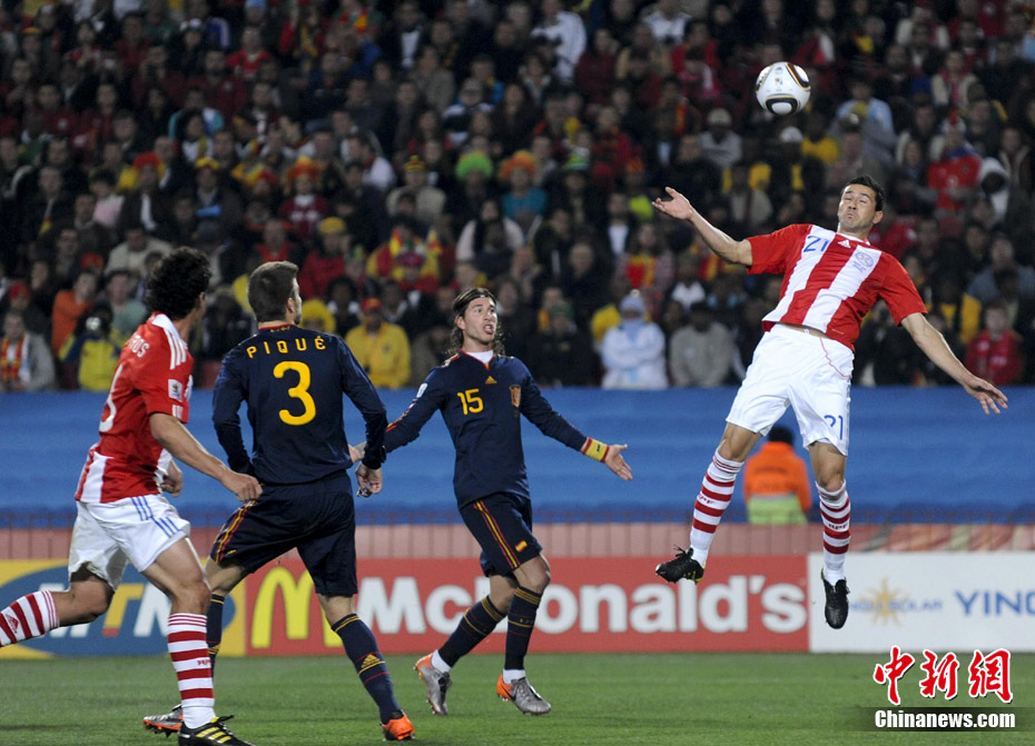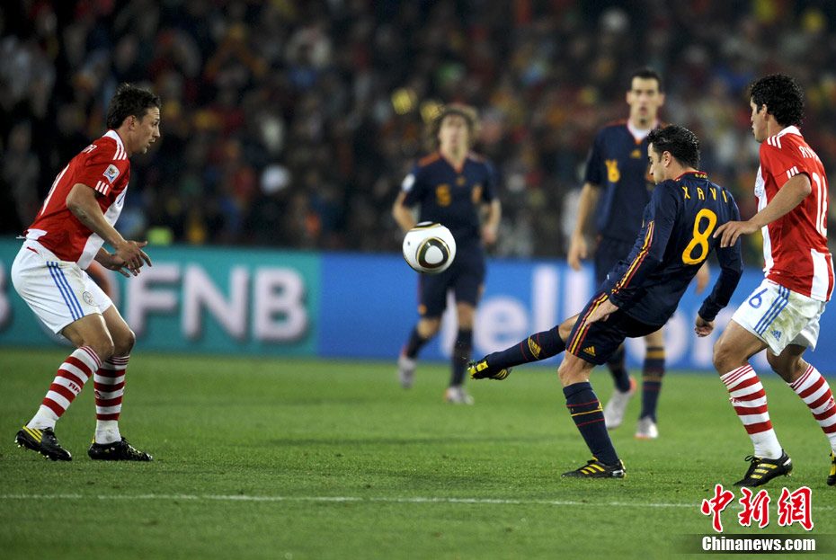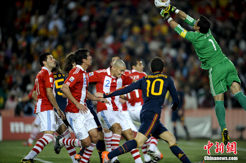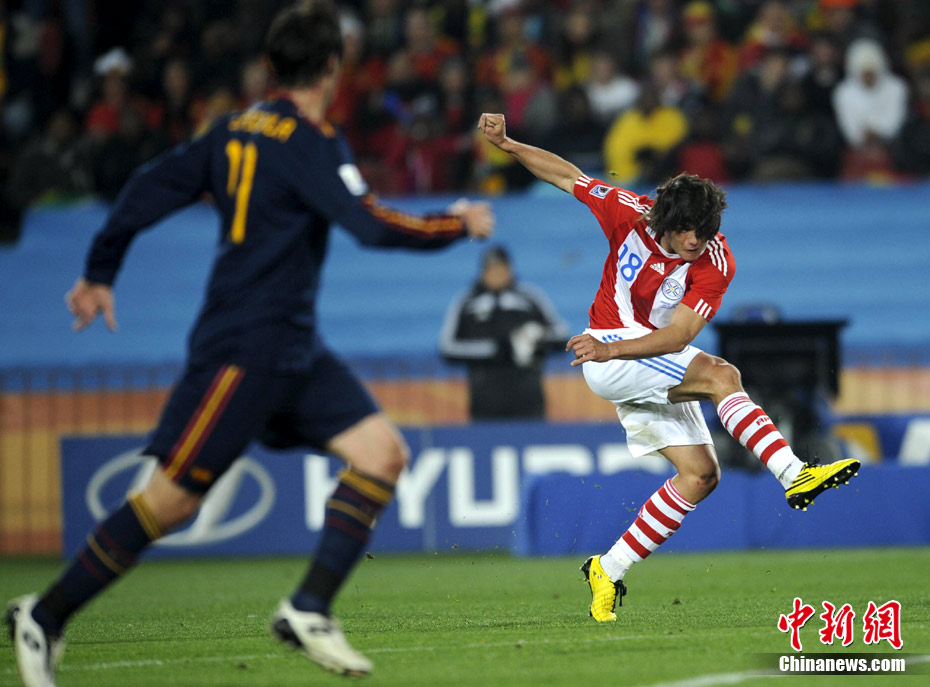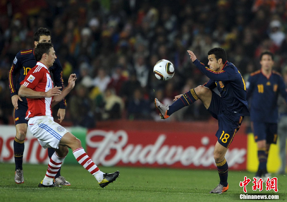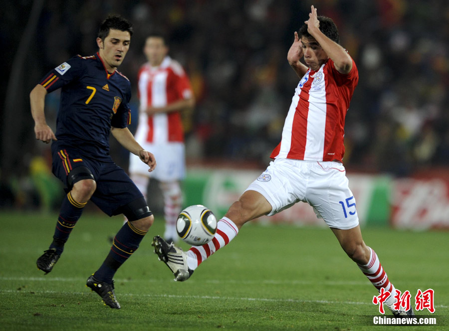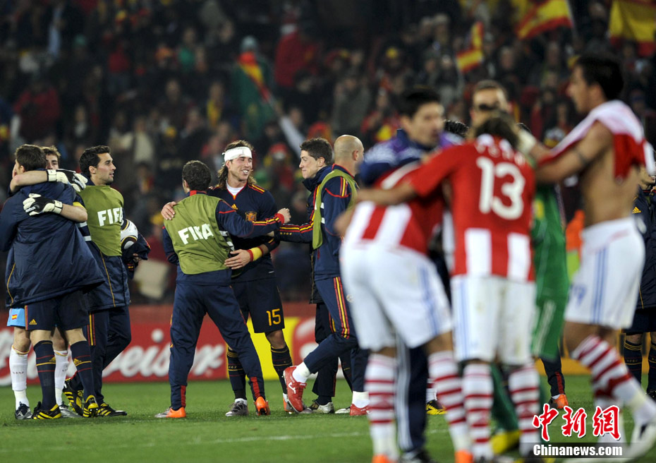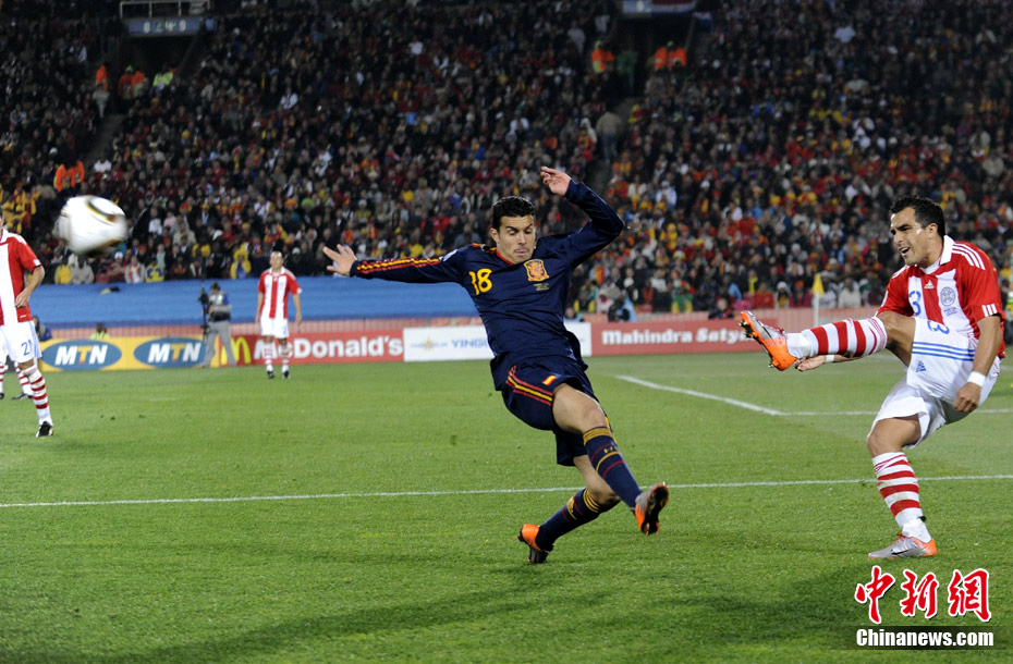 7月4日凌晨,南非世界杯最后一場1/4決賽打響,西班牙在約翰內(nèi)斯堡的愛麗絲公園球場迎來了南美勁旅巴拉圭隊。憑借比利亞在第83分鐘的進(jìn)球,西班牙1-0擊敗巴拉圭,晉級四強(qiáng)。中新社記者 廖攀 攝