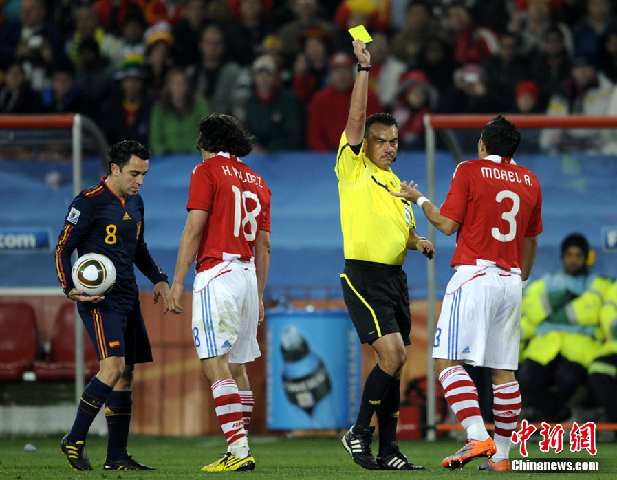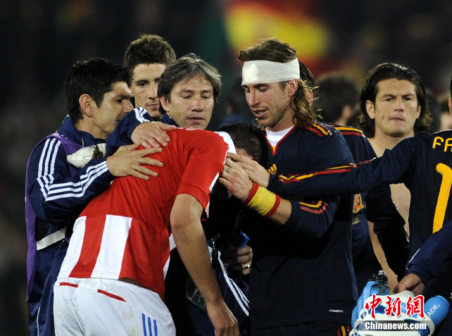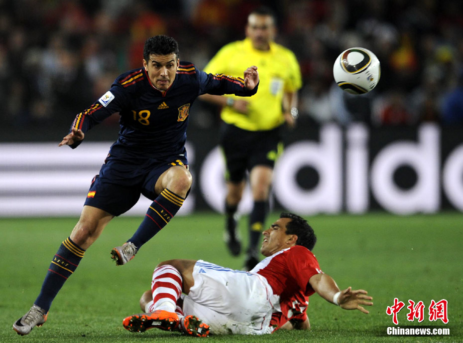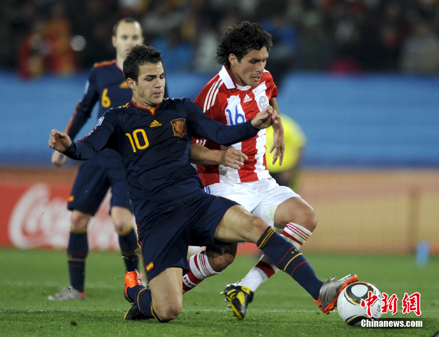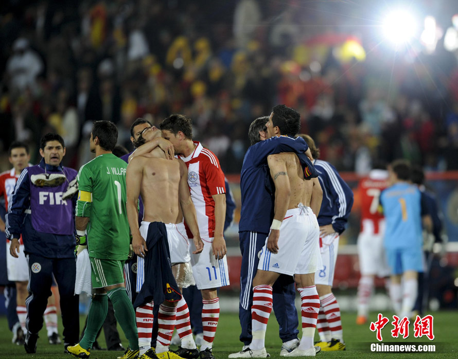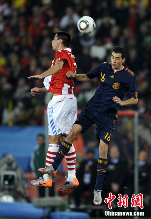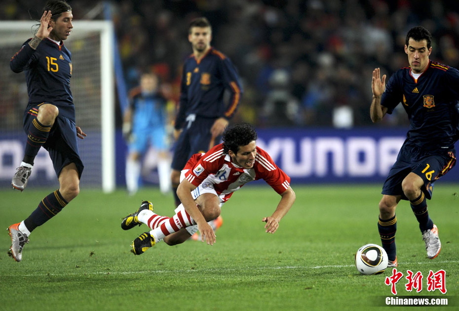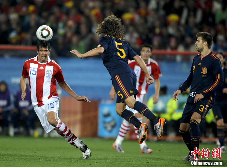 7月4日凌晨,南非世界杯最后一場1/4決賽打響,西班牙在約翰內(nèi)斯堡的愛麗絲公園球場迎來了南美勁旅巴拉圭隊。憑借比利亞在第83分鐘的進(jìn)球,西班牙1-0擊敗巴拉圭,晉級四強(qiáng)。中新社記者 廖攀 攝