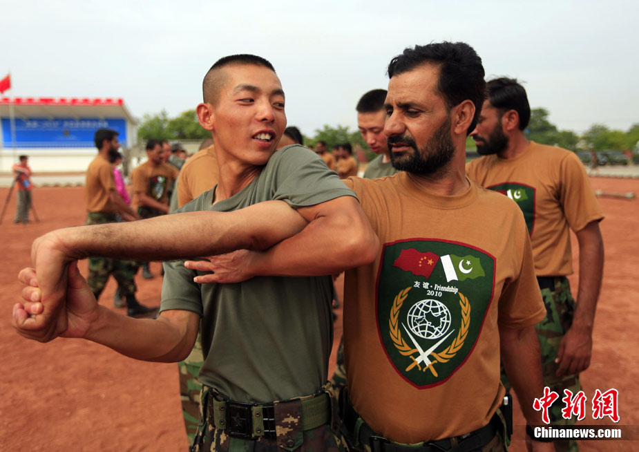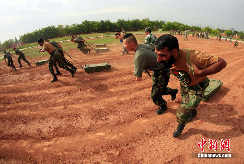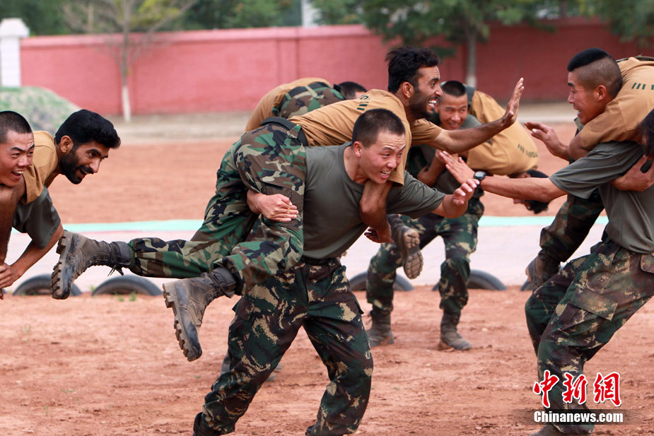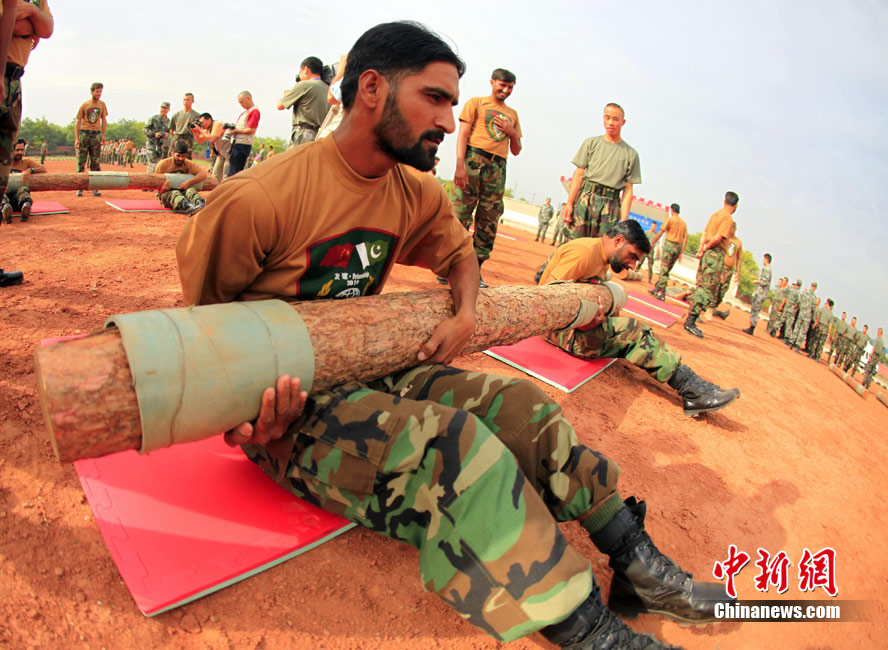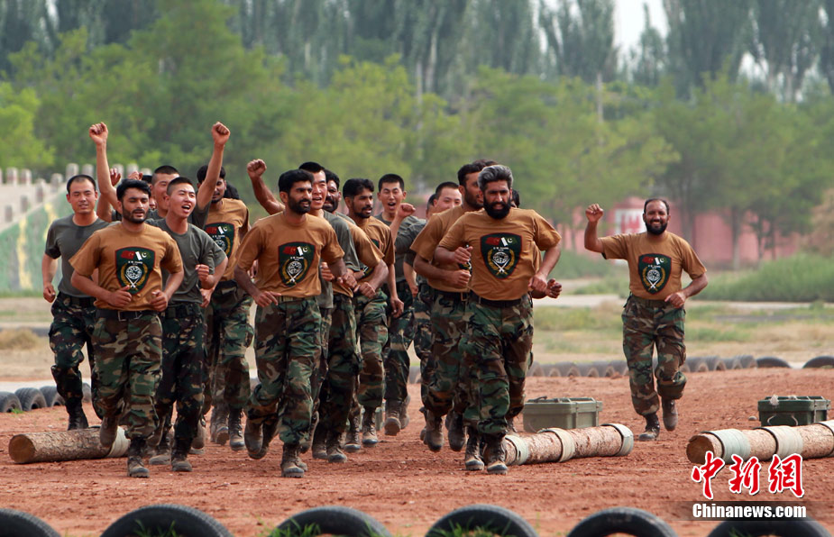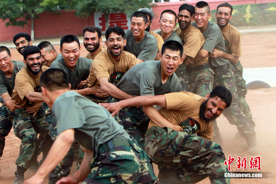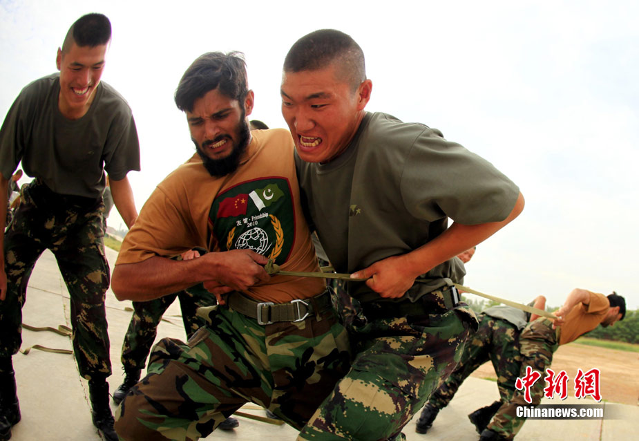 7月4日,參加“友誼—2010”中國巴基斯坦反恐聯(lián)合訓(xùn)練的兩軍士兵進行體能訓(xùn)練。此次訓(xùn)練在中國寧夏青銅峽地區(qū)展開,主要以邊境地區(qū)山地聯(lián)合反恐作戰(zhàn)為課題,分為展示交流、混編同訓(xùn)、綜合演練三個階段。這是兩國之間舉行的第三次反恐聯(lián)合訓(xùn)練。中新社發(fā) 杜洋 攝
