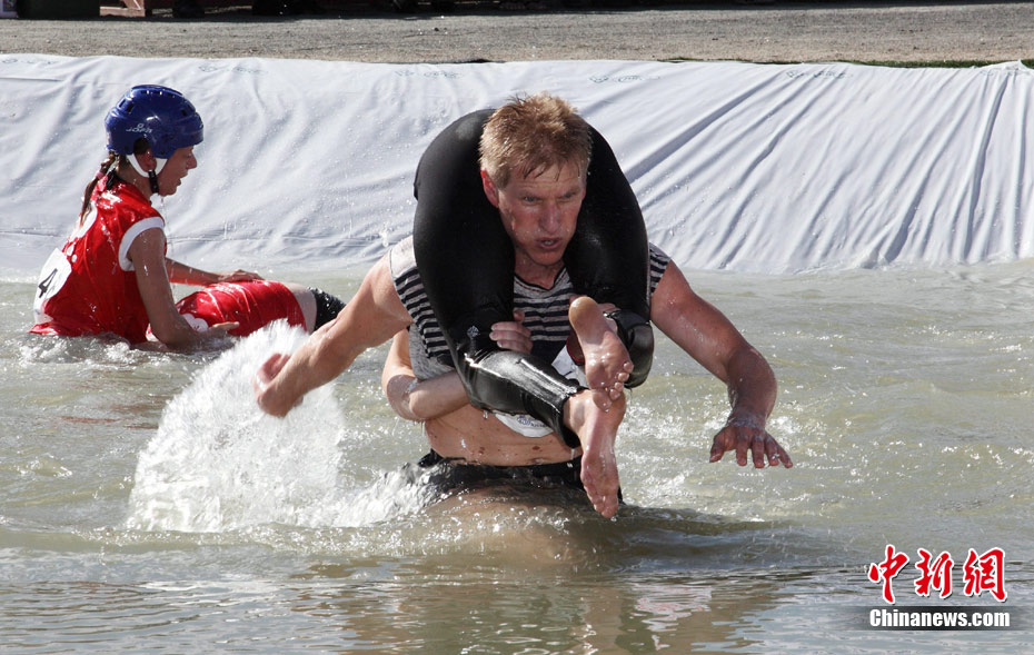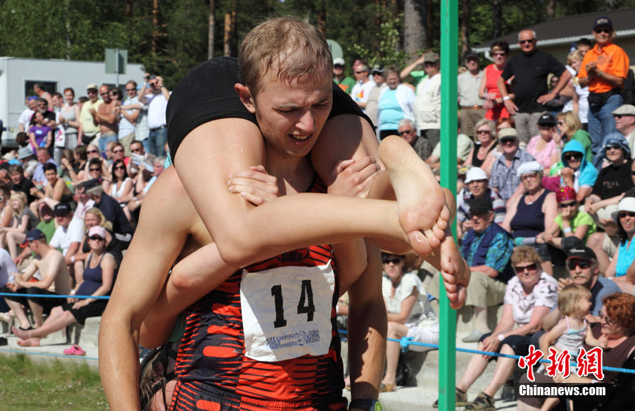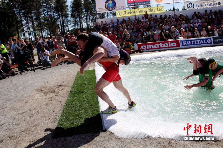 7月3日,一年的一度的世界背老婆大賽在芬蘭中部小鎮(zhèn)松卡耶爾維舉行,參賽者背著自己的老婆在泳池里行走,最終來自芬蘭的一對選手最先通過終點。