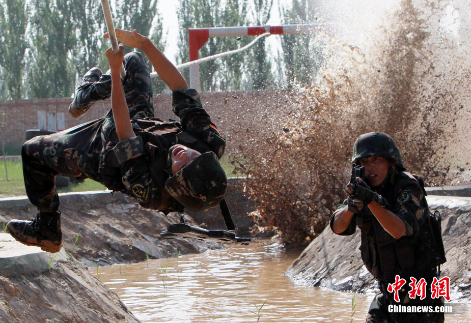 7月5日,中巴兩軍特戰(zhàn)士兵展開(kāi)高強(qiáng)度魔鬼訓(xùn)練。此次代號(hào)為“友誼—2010”的中國(guó)巴基斯坦反恐聯(lián)合訓(xùn)練在中國(guó)寧夏青銅峽地區(qū)展開(kāi),訓(xùn)練主要以邊境地區(qū)山地聯(lián)合反恐作戰(zhàn)為課題,分為展示交流、混編同訓(xùn)、綜合演練三個(gè)階段。 中新社發(fā) 杜洋 攝
