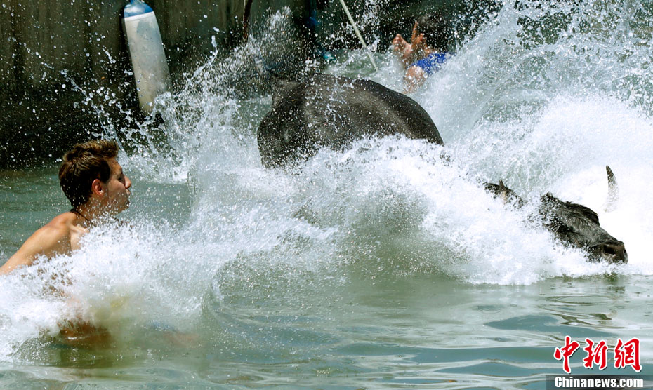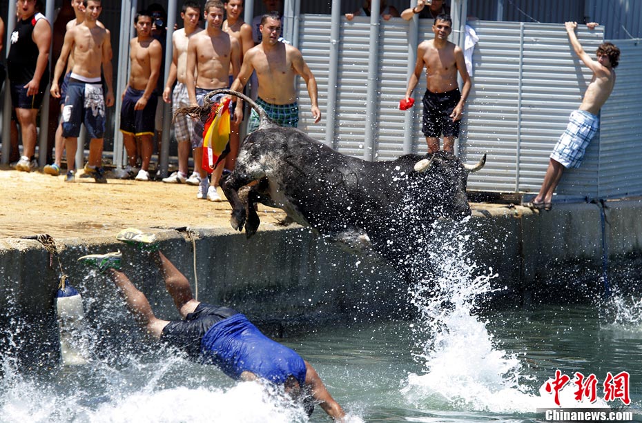7月5日,西班牙東部德尼那小鎮(zhèn)一年一度的海邊奔牛節(jié)再度舉行。這里的奔牛節(jié)與眾不同,斗牛士們挑逗著一頭頭暴躁的公牛跳入海中,俗稱“奔牛入!眻(chǎng)面蔚為壯觀。