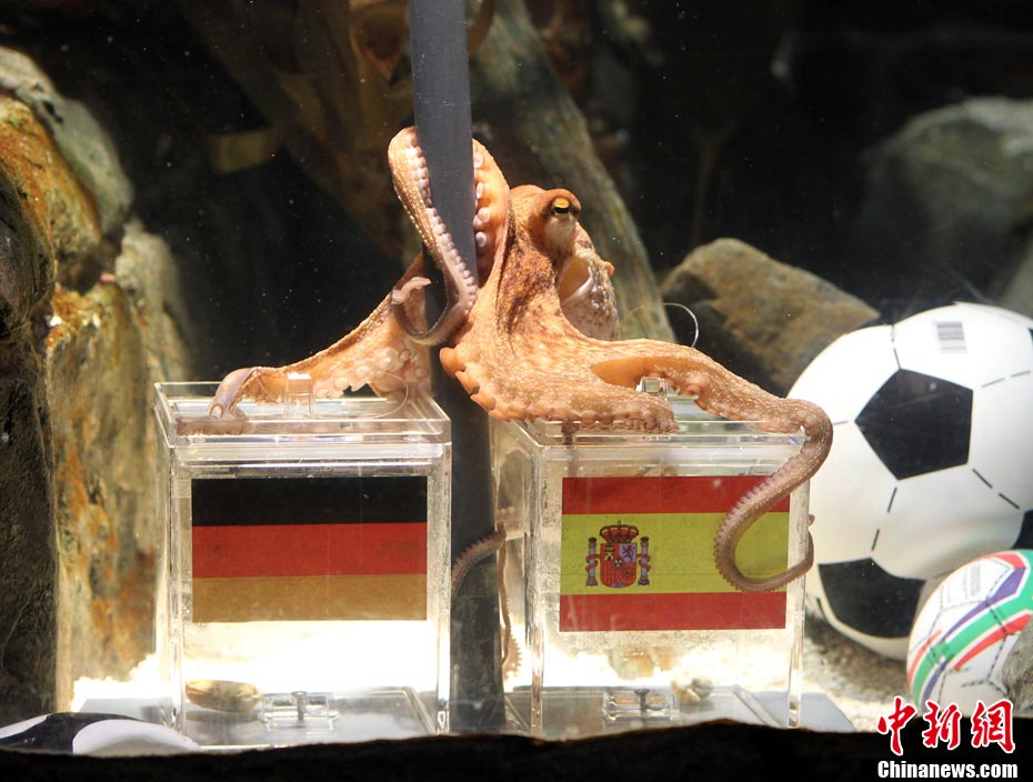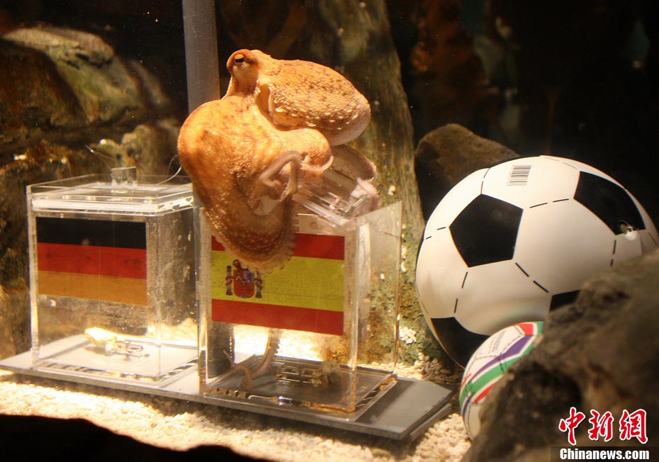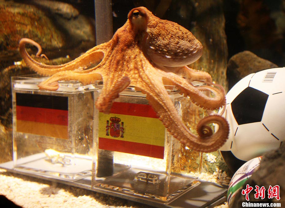 7月6日下午,德國某水族館的章魚保羅再次出動,對世界杯半決賽德國與西班牙進(jìn)行了預(yù)測,最終他選擇了西班牙。保羅認(rèn)為歐洲冠軍西班牙將在半決賽擊敗勢頭強勁的德國隊進(jìn)入決賽!秷D片報》網(wǎng)站的直播員在公布結(jié)果的同時說道:“希望勒夫的小伙子們能扭轉(zhuǎn)局勢,拯救這場半決賽!被蛟S,對于德國球迷來說還有一個自我安慰的理由:保羅在2008年歐錦賽上預(yù)測的準(zhǔn)確率是80%,并且唯一錯的就是決賽與西班牙之戰(zhàn)。他們或許已經(jīng)開始期待:兩年后的世界杯預(yù)測不要百發(fā)百中,至少在半決賽時錯一次。