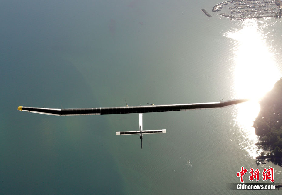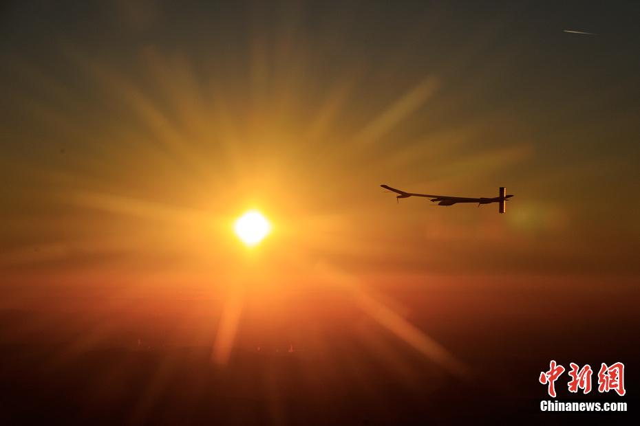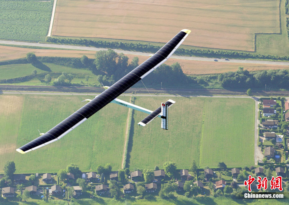 7月8日,太陽能飛機“太陽驅動”在空中飛行。世界最大太陽能飛機——瑞士制造的“太陽驅動”飛行26小時后,于當?shù)貢r間8日9時在瑞士帕耶那機場降落,成功完成首次晝夜試飛。這是世界上首次進行太陽能飛機的夜間試飛。